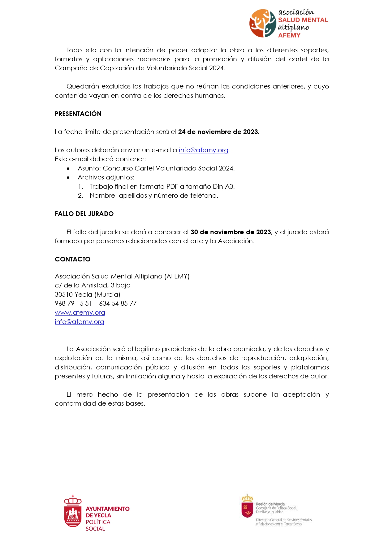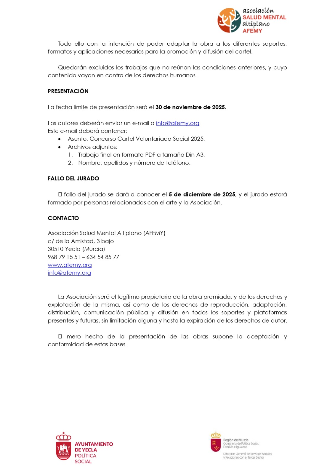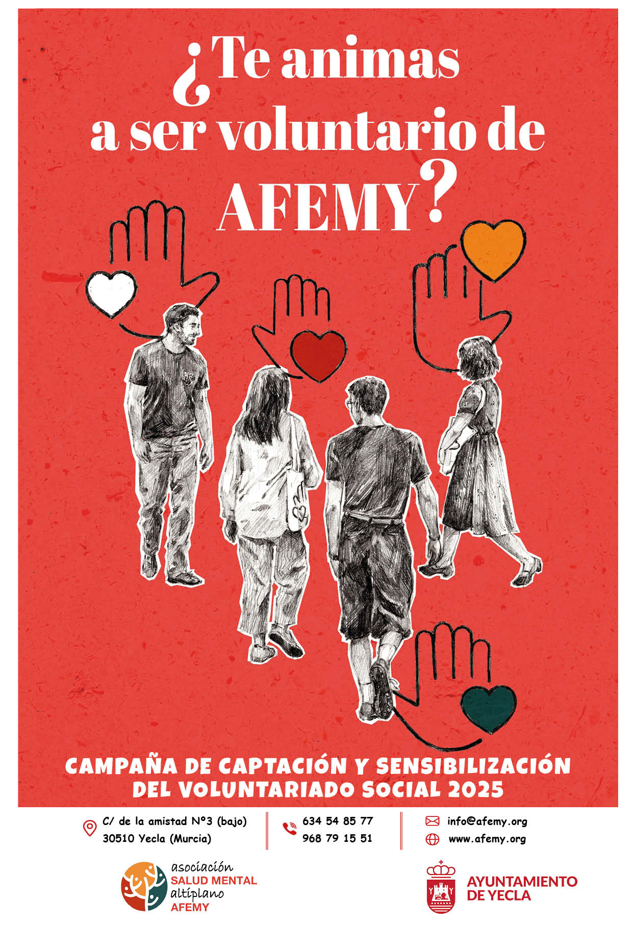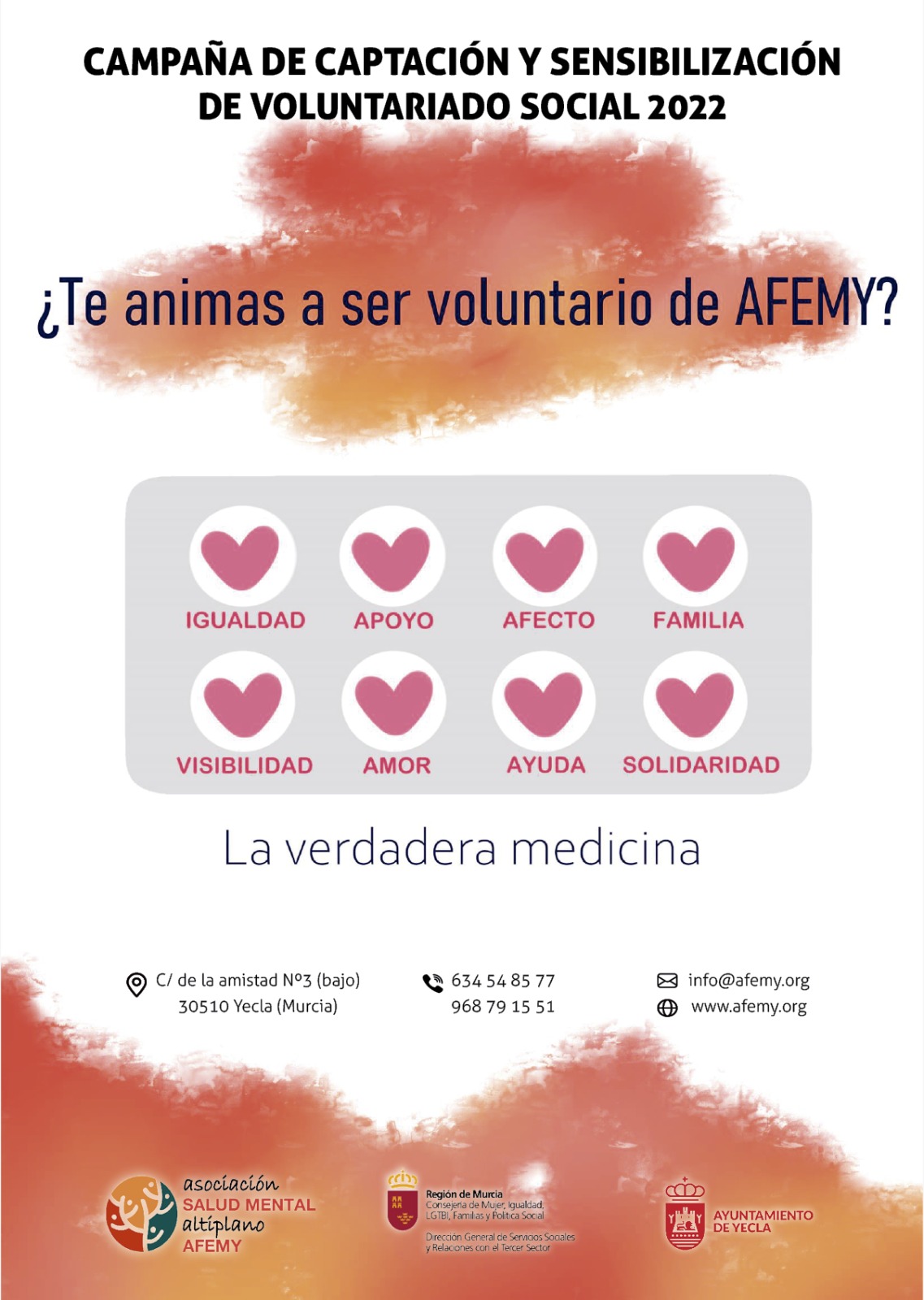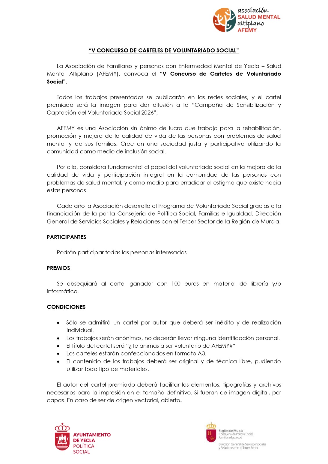 La Asociación de Familiares y personas con Enfermedad Mental de Yecla- Salud Mental Altiplano (AFEMY), convoca el “lll Concurso de Carteles de Voluntariado Social”.