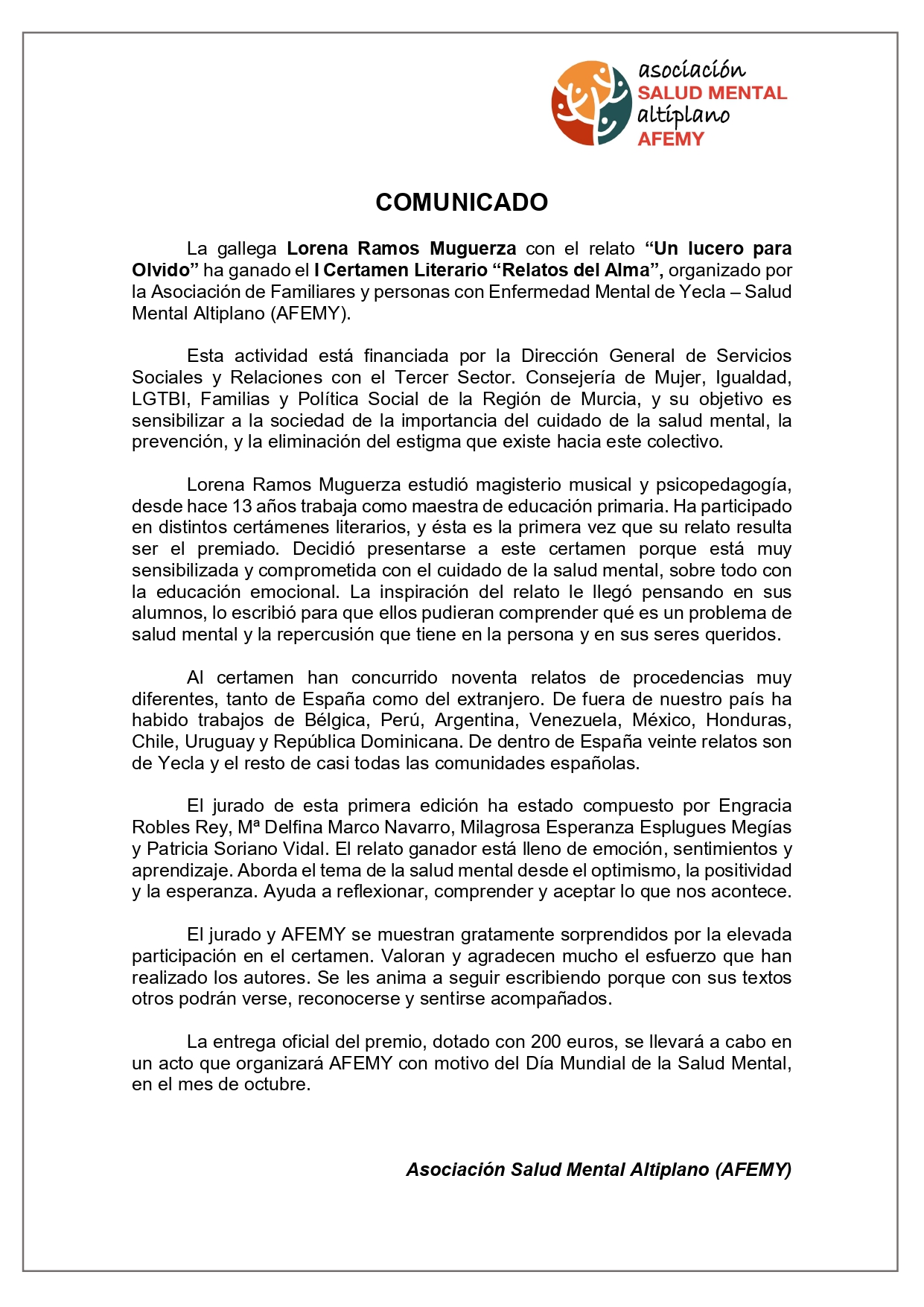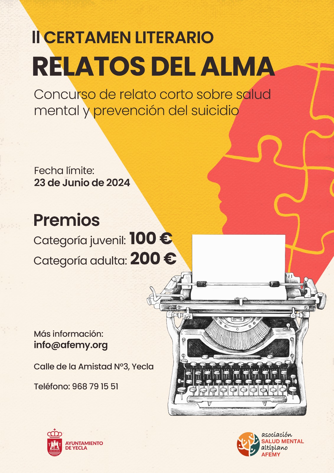 La Asociación de Familiares y personas con Enfermedad Mental de Yecla – Salud Mental Altiplano (AFEMY), convoca el II Certamen Literario “RELATOS DEL ALMA”,