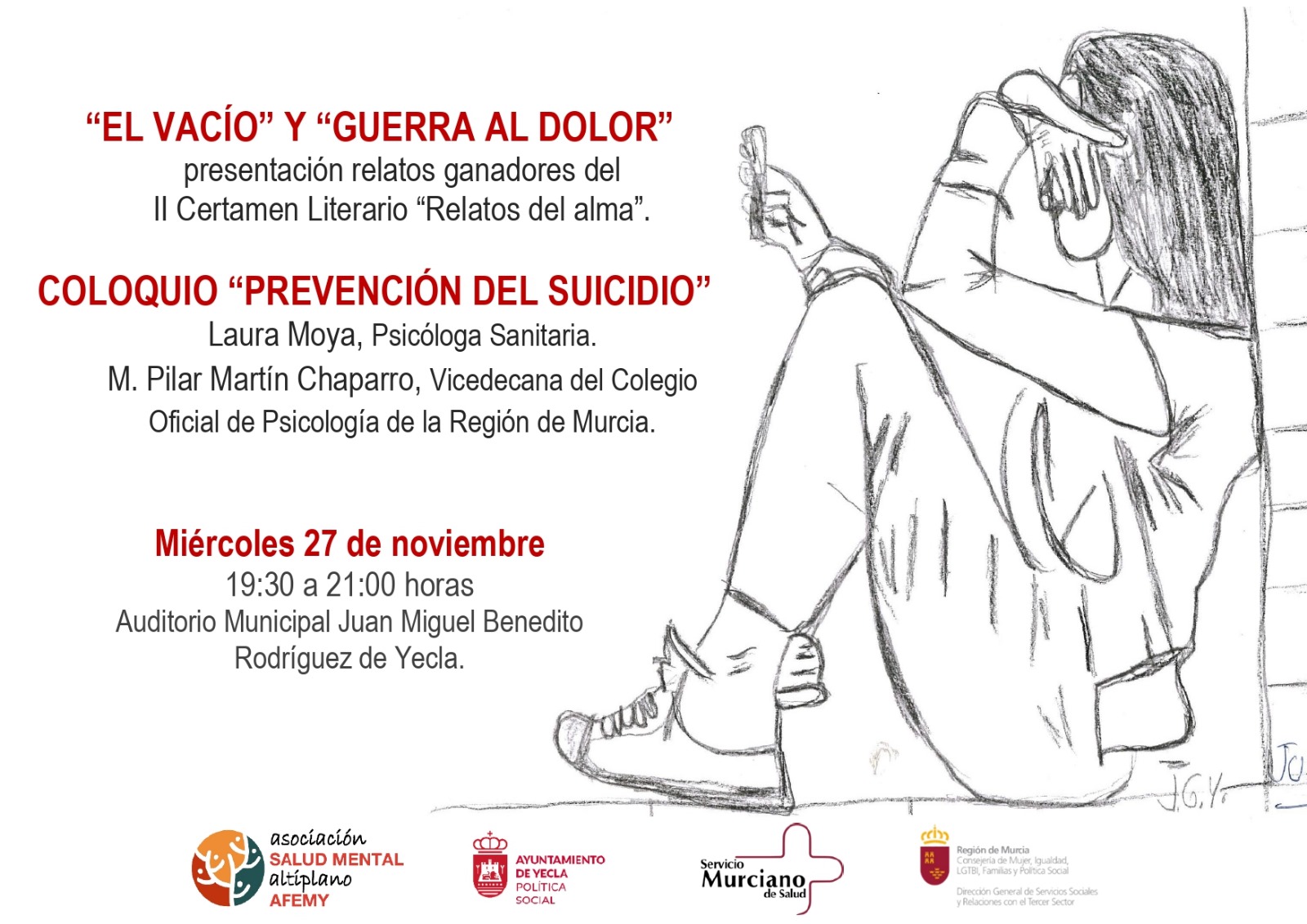 La Asociación de Familiares y personas con Enfermedad Mental de Yecla – Salud Mental Altiplano (AFEMY) organiza el próximo 27 de noviembre en el Auditorio Municipal Juan Miguel Benedito Rodríguez de Yecla, la actividad Coloquio “Prevención del suicidio”, para hablar sobre el problema del suicidio que sigue siendo un fenómeno social silenciado.