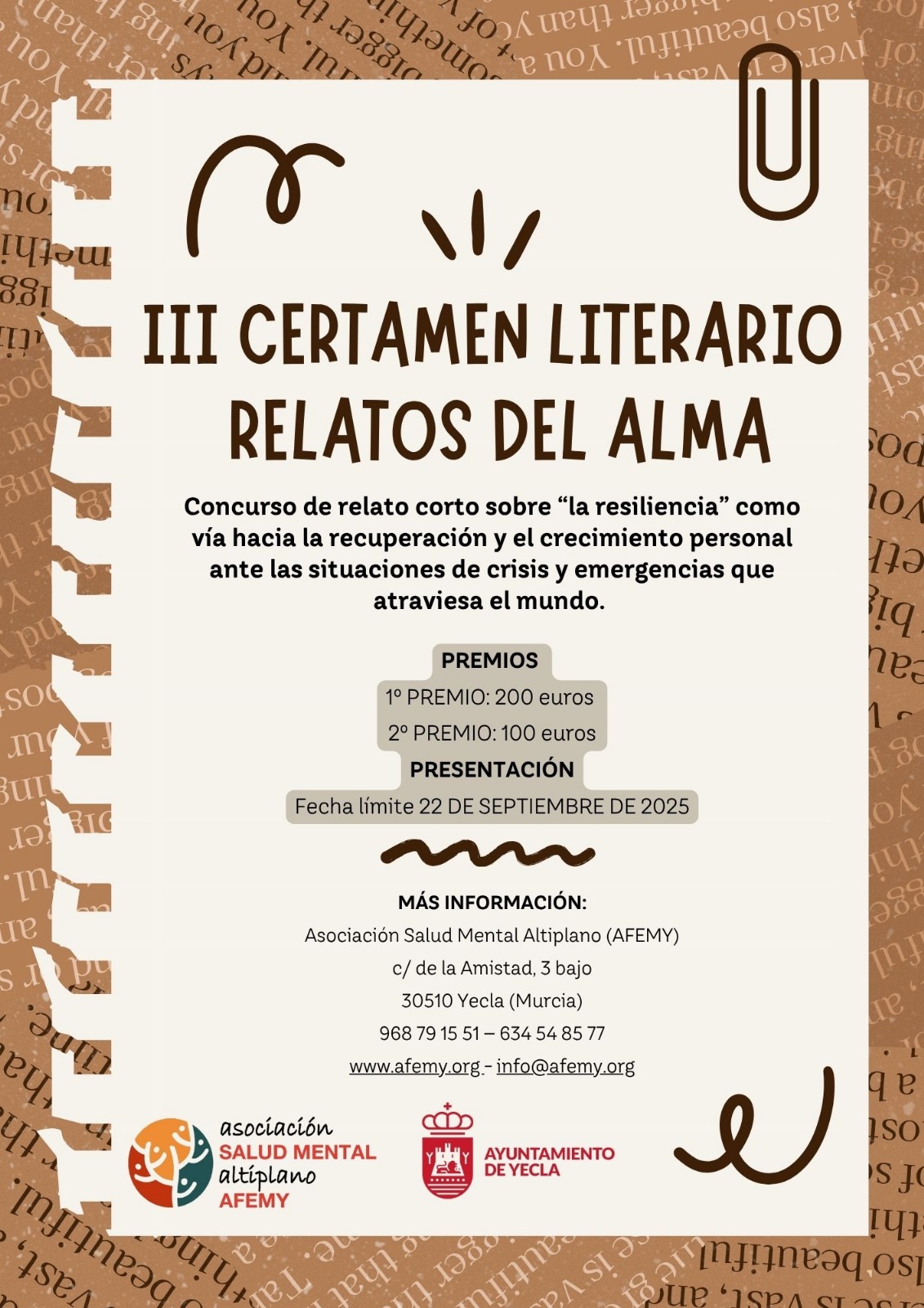 La Asociación de Familiares y personas con Enfermedad Mental de Yecla – Salud Mental Altiplano (AFEMY), convoca el III Certamen Literario “RELATOS DEL ALMA”,